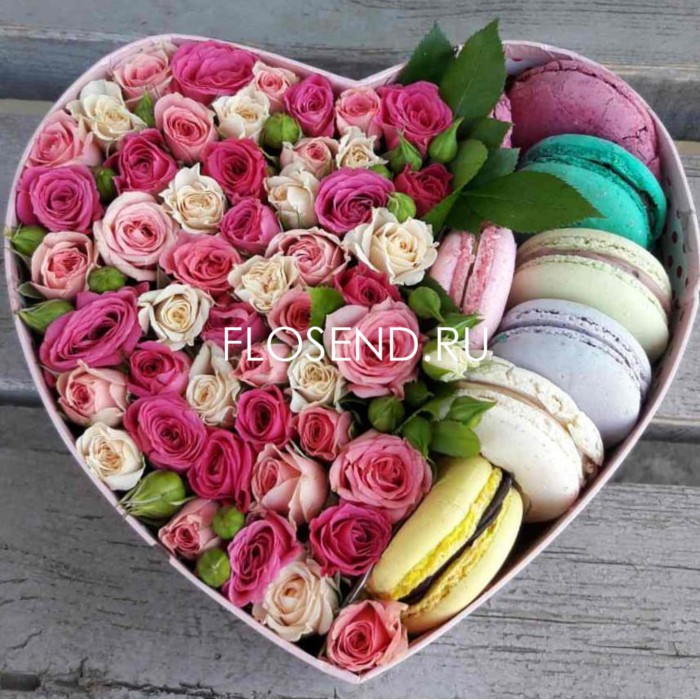 9 кустовых роз и макаронс в коробке сердце в Железнодорожном