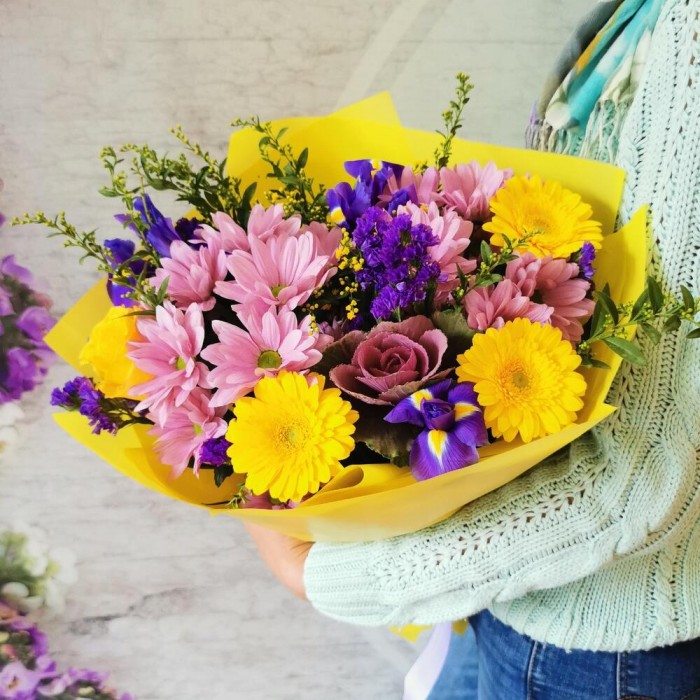 Букет с ирисами и хризантемами и герберами в Железнодорожном
