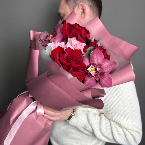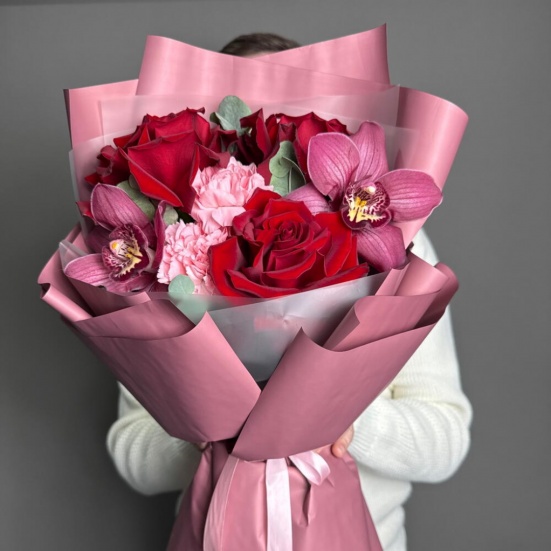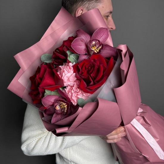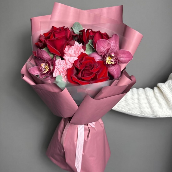 Букет из 3 красных роз, орхидей и диантуса в Железнодорожном