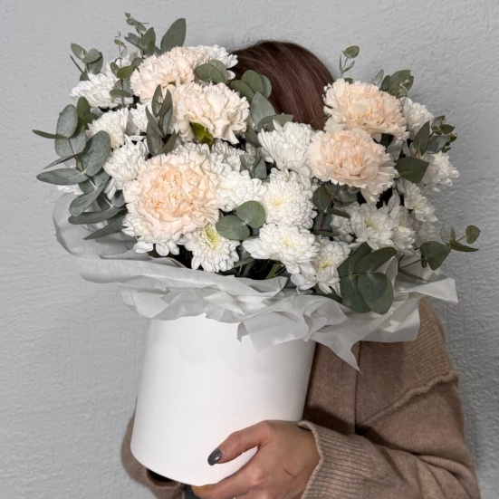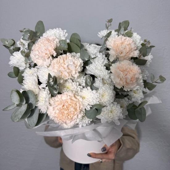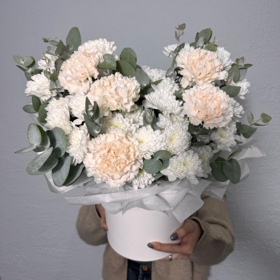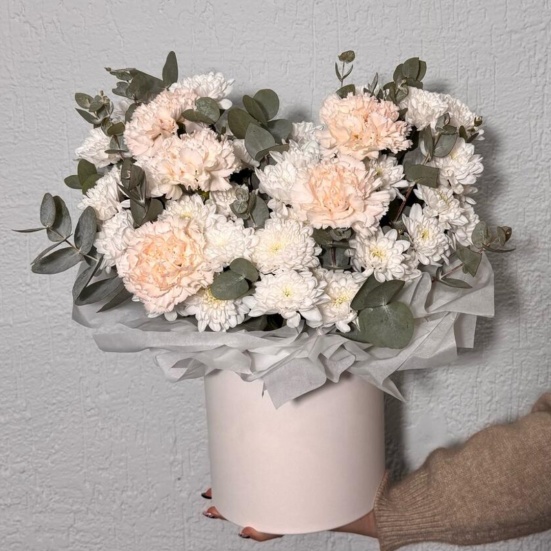 Коробка из кустовых хризантем и диантуса в Железнодорожном